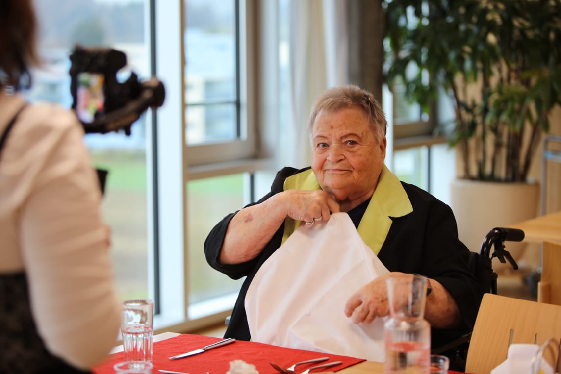 Die Dreharbeiten im Speisesaal dauern zwei Stunden und sind für alle Beteiligten etwas Besonderes. Für Frau Schnider, die Filmcrew, die Mitarbeitenden und die Unternehmenskommunikation entsteht in dieser kurzen Zeit etwas Verbindendes. Denn überall dort, wo Menschen einander begegnen, entsteht mehr als nur ein Moment: Es entsteht Austausch, Verständnis und Beziehung. Frau Schnider wird durch ihren Auftritt Teil der Öffentlichkeit, die jungen Filmschaffenden sammeln Erfahrungen im Kontakt mit einer älteren Generation, und die Mitarbeitenden erleben einmal mehr, wie wertvoll ihre tägliche Arbeit ist.